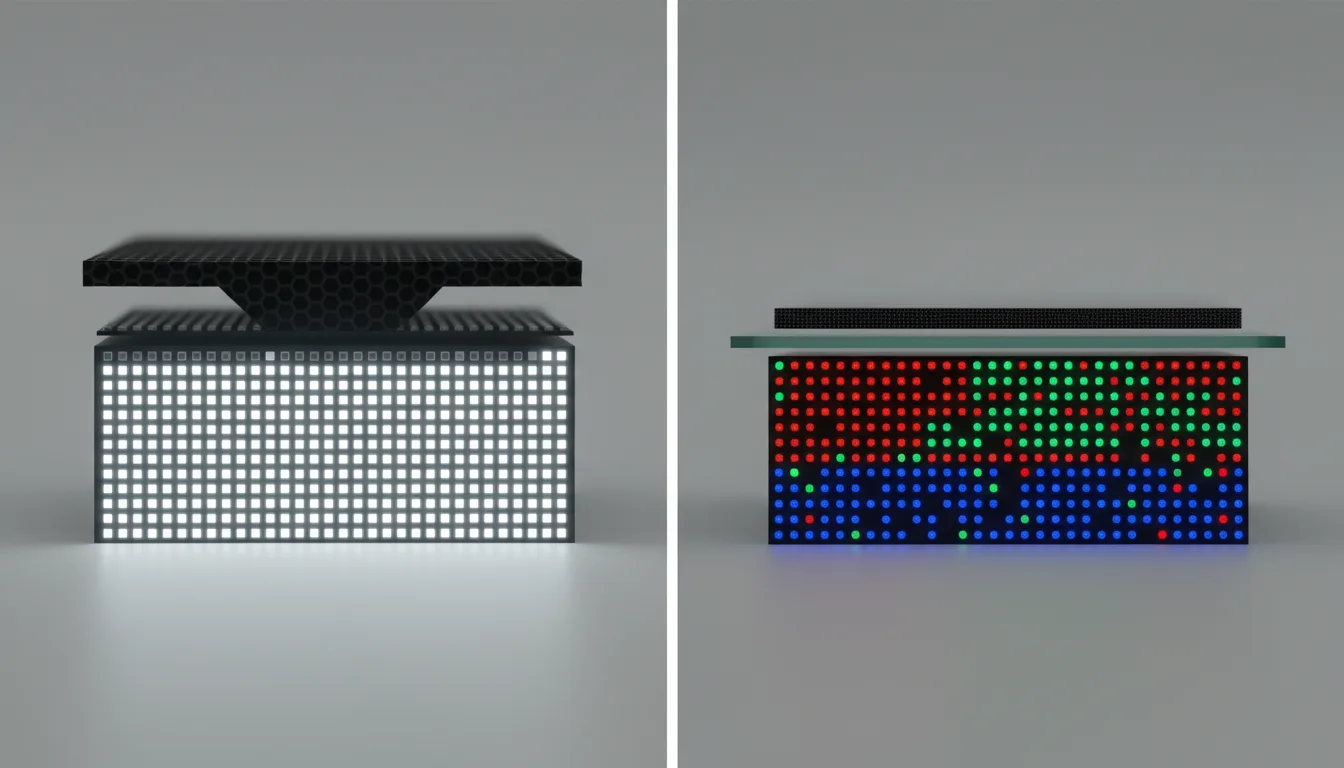 The confusion between Mini-LED and QLED starts with a fundamental misunderstanding: they operate on entirely different layers of the TV panel. Think of a TV as a sandwich. The backlight sits at the back, the LCD panel forms the middle, and the color filter sits between them. QLED upgrades the color filter. Mini-LED upgrades the backlight. They are not competing approaches to the same problem — they are complementary improvements to different parts of the display stack.