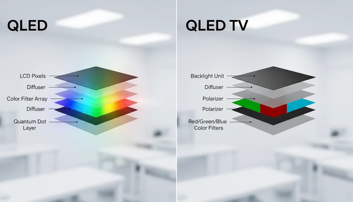 QLED adds one component: a quantum dot filter layer between the LED backlight and LCD panel. These microscopic semiconductor particles emit very specific colors when hit by light. Blue LEDs excite the quantum dots, which then emit pure red and green light. This creates more saturated, accurate colors than traditional white LED + color filter combinations.